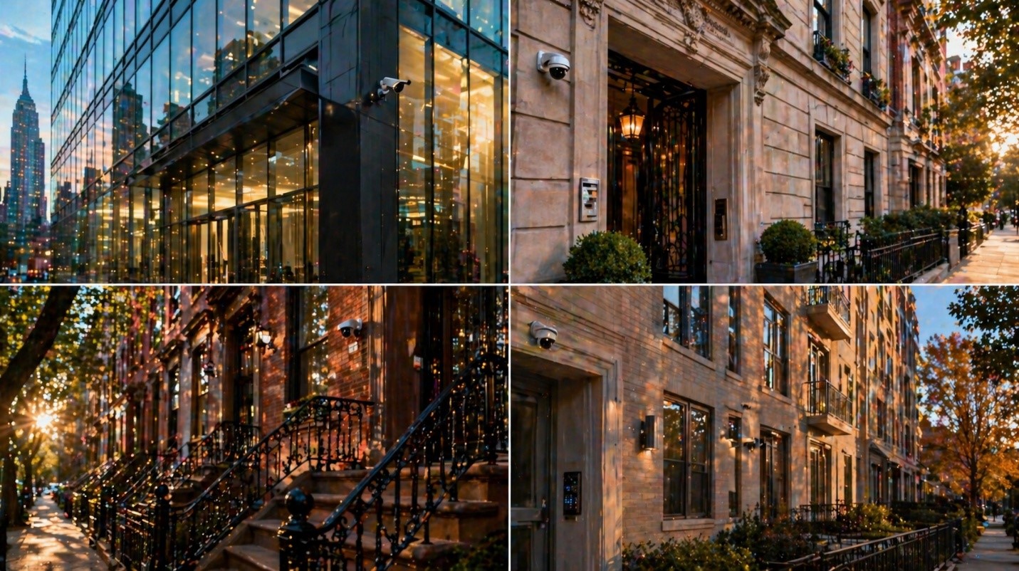Luxury residential. Savant home automation, distributed audio, home theater, video intercom upgrades for pre-war buildings, and discreet camera installation that respects architectural detail. Co-op board approval and fully insured installers (typically $2M minimum liability) are non-negotiable.
